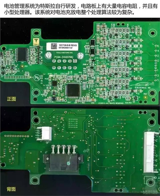電池管理系統(tǒng)主要功能包括數(shù)據(jù)采集、電池狀態(tài)計(jì)算、能量管理、熱管理、安全管理、均衡控制和通信功能等。從電路圖上可看到,電池管理系統(tǒng)為特斯拉自行研發(fā),擁有高度的知識(shí)產(chǎn)權(quán)的核心技術(shù)。該系統(tǒng)能自行處理充放電以及發(fā)熱問(wèn)題。相信國(guó)內(nèi)廠商較難山寨出來(lái)。